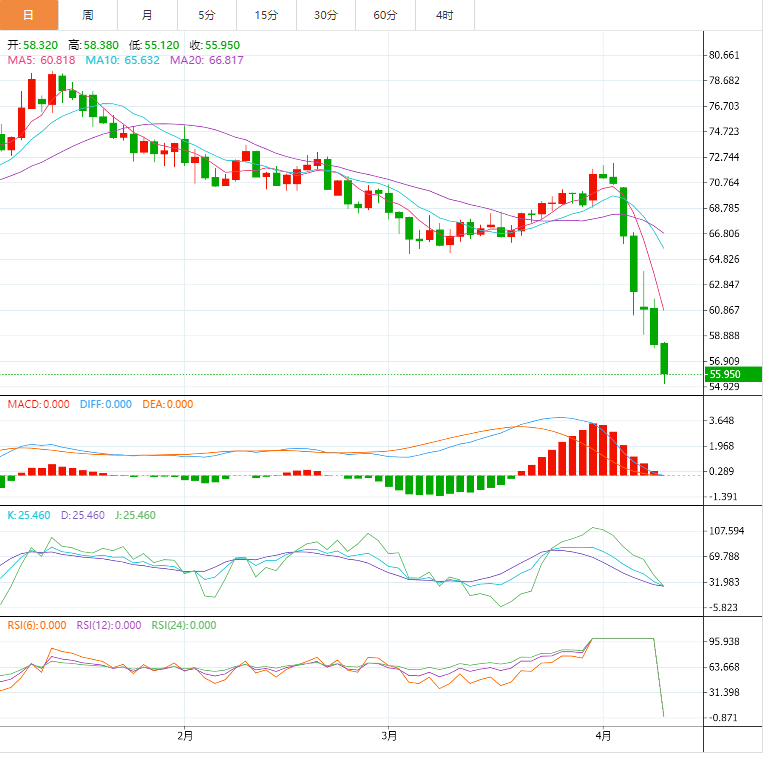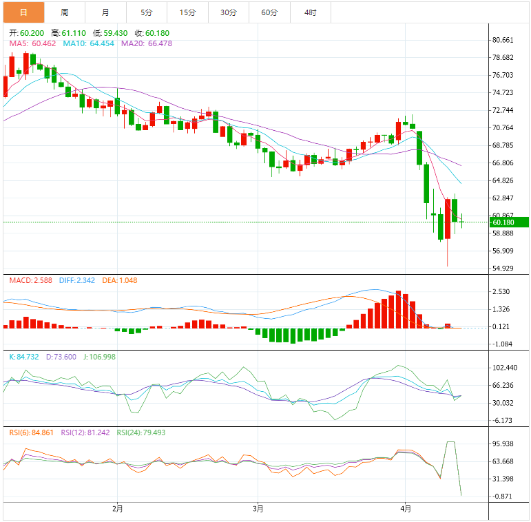 在全球经济与贸易局势持续动荡的大背景下,原油与黄金这两大重要资产的价格走势,犹如金融市场的晴雨表,时刻牵动着投资者的心弦。4月9日,二者价格波动显著,背后蕴含着复杂的市场逻辑与技术信号。 原油盘面分析 周三(4月9日),美原油价格延续跌势,持续下探,当前交投于57.2美元/桶附近。全球贸易冲突不断加剧