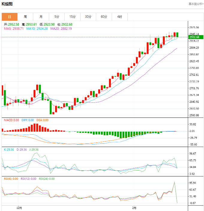 黄金、白银、原油、贵金属2月24日收盘情况: 周一,因对特朗普关税计划的担忧情绪推动避险需求,黄金价格飙升升至历史新高,且全球最大黄金支持的TF资金流入也为金价提供额外支撑。 现货黄金周一收盘大涨16.68美元,涨幅0.57%,报2952.43美元/盎司。金价周一盘中最高触及2956.29美元/盎司,创下历史高位,创下今年迄今