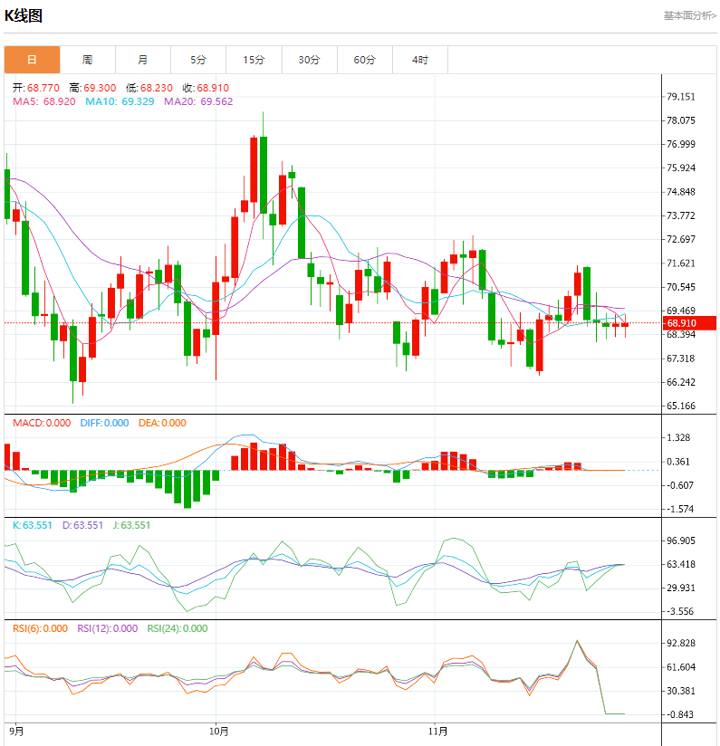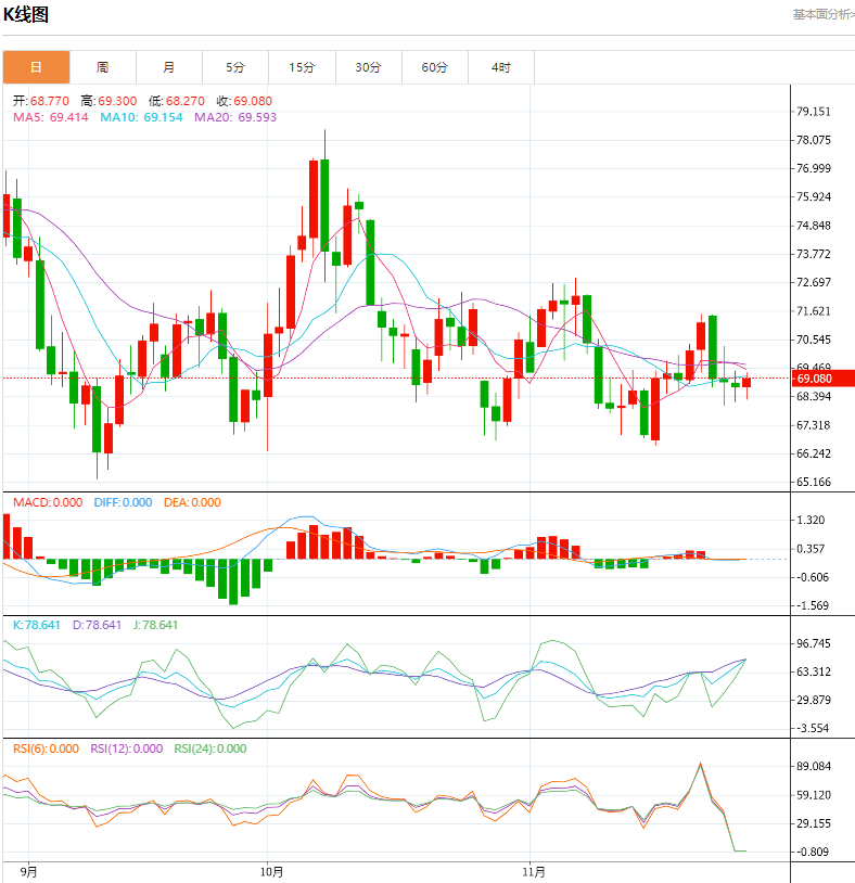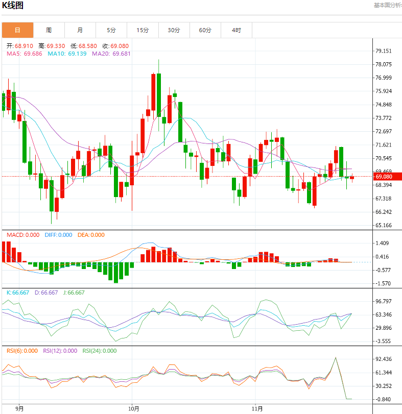 星期四(11月28日)。黎以达成停火协议,但前提市场已对相关消息提前作出了反应,并未引起太大波澜。但如果后期双方对停火协议的执行力度极差,地缘风险溢价恐将再度升高,所以市场仍对停火能否持续持谨慎态度。 原油盘面分析: 原油H4级别遇阻回落,并在48日多空分界线下方运行。此外,ACD双线和量能柱在