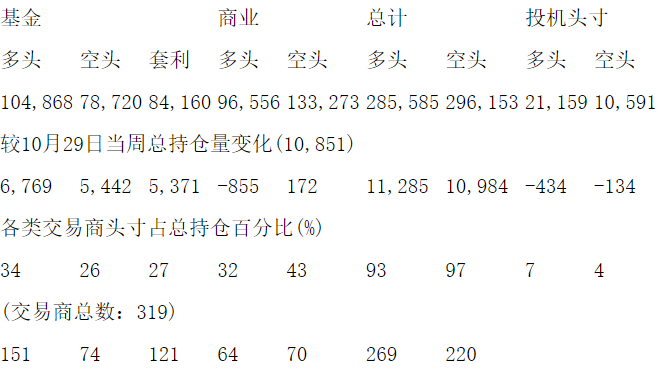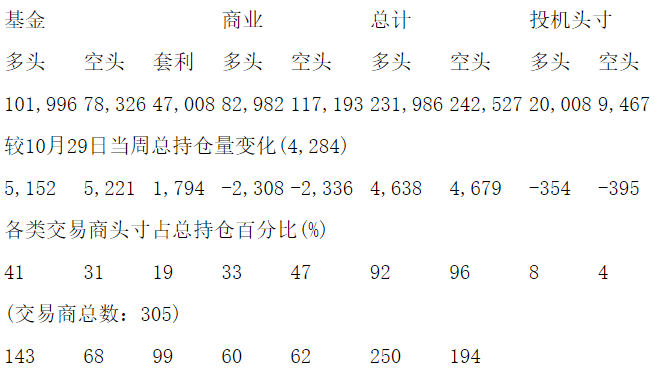 美国商品期货交易委员会(CFTC)最新公布截止11月5日当周COX铜期货和期权分类持仓报告: 合约单位:25000磅总持仓量:306744