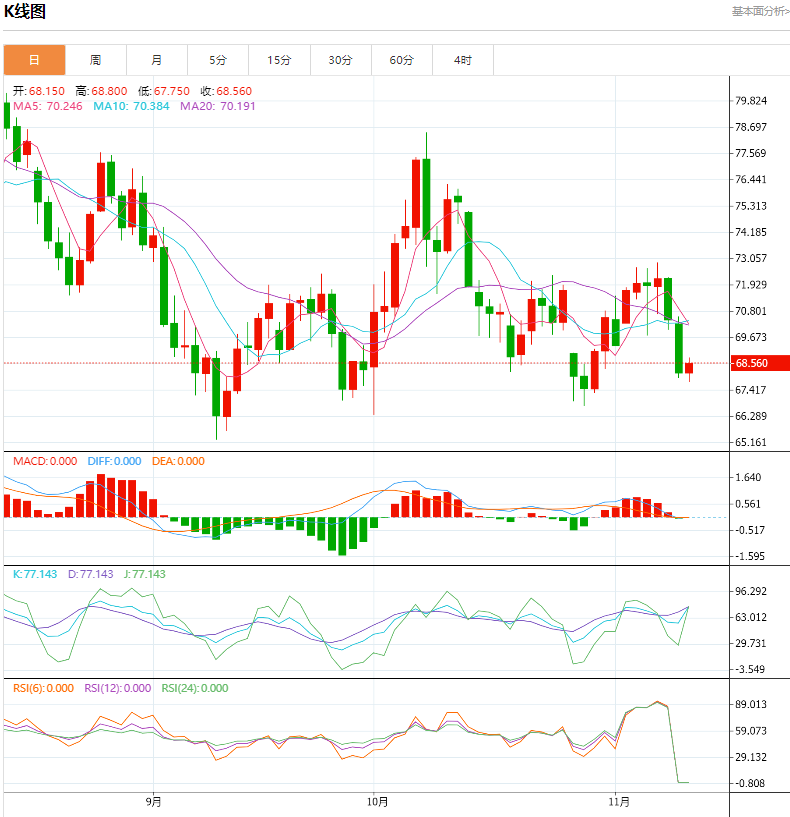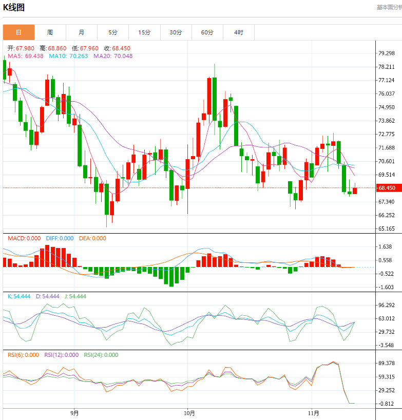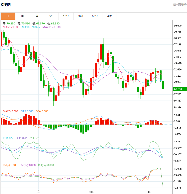 上一交易日(11月12日),现货黄金连日下跌,一度失守2590美元/盎司,为9月以来首次,最终收跌0.81%,报2598.41美元/盎司,创近两个月新低。现货白银最终收涨0.14%,报30.74美元/盎司。 原油盘面分析: 原油市场目前正处于供需两端的紧张博弈之中。供应紧张为油价提供了一定的支撑,而需求前景的不确定性则