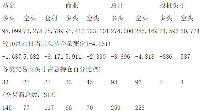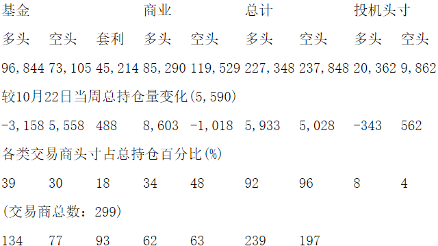 美国商品期货交易委员会(CFTC)最新公布截止10月29日当周COX铜期货和期权分类持仓报告: 合约单位:25000磅总持仓量:295893