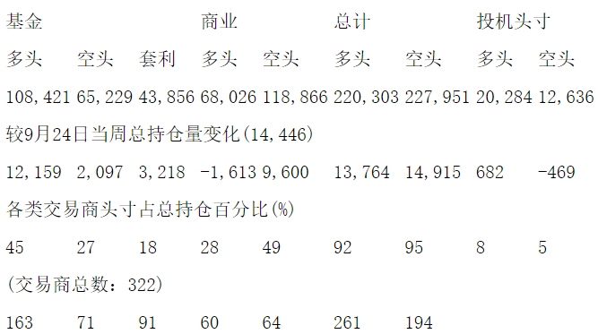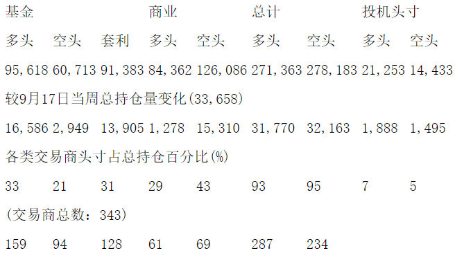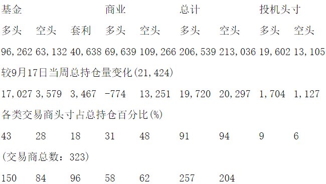 美国商品期货交易委员会(CFTC)最新公布截止9月24日当周COX铜期货和期权分类持仓报告: 合约单位:25000磅总持仓量:292616