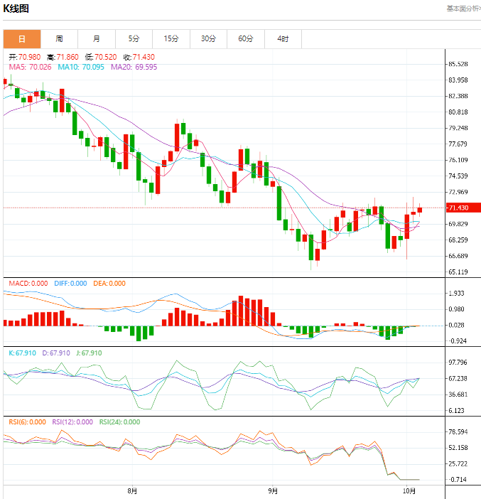 星期四(10月3日),连续两日反弹回升后,昨日国际原油价格冲高遇阻回落,于72.5下方迎来调整,短线或将延续多空宽幅震荡区间。 原油盘面分析: 油价周四一度大跌超过3%,创下逾两周新低,此前报道称,世界头号原油出口国沙特阿拉伯将放弃100美元的价格目标,准备在12月与石油输出国组织(OC)成员国和盟国一起