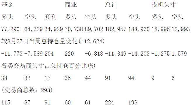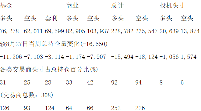 美国商品期货交易委员会(CFTC)最新公布截止9月3日当周COX铜期货和期权分类持仓报告: 合约单位:25000磅总持仓量:249421