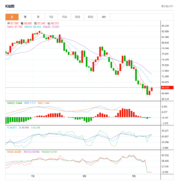 布伦特原油价格预计将上涨3.02美元/桶。 原油盘面分析: 星期四(9月12日)亚市盘面,美原油价格目前交投于67.5美元/桶附近。飓风弗朗辛扰乱美石油生产提供支撑,国际原油价格短线走出V型形态,在65.6附近支撑反弹回升,收复前期部分失地。 黄金盘面分析: 现货黄金维持日内反弹走势,目前金价