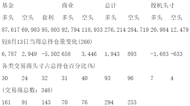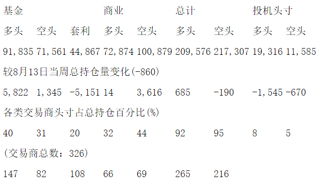 美国商品期货交易委员会(CFTC)最新公布截止8月20日当周COX铜期货分类持仓报告: 合约单位:25000磅总持仓量:228892