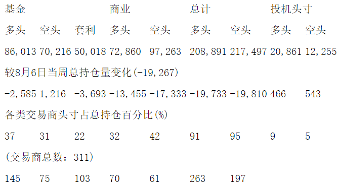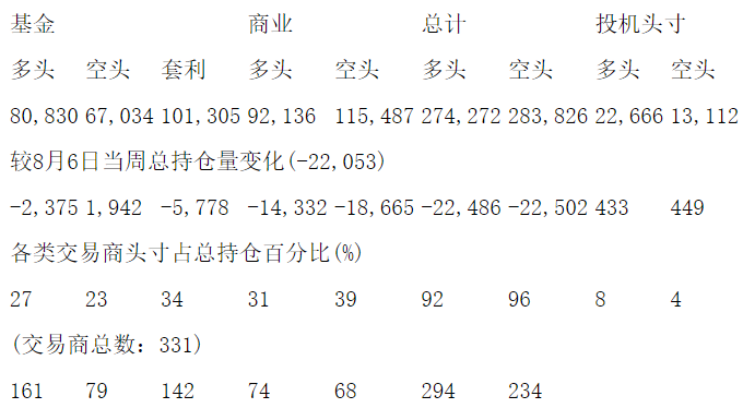 美国商品期货交易委员会(CFTC)最新公布截止8月13日当周COX铜期货分类持仓报告: 合约单位:25000磅总持仓量:229752