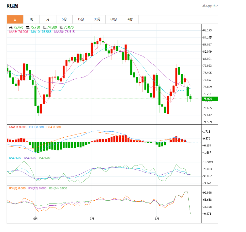 原油价格目前交投于75.4美元/桶附近。上周,中东进一步冲突尚未实质爆发,但停火谈判仍未取得进展,周五市场(8月16日),油价整体呈现压制偏空震荡。 原油盘面分析: 原油价格目前交投于75.5美元/桶附近。上周,中东进一步冲突尚未实质爆发,但停火谈判仍未取得进展,周五市场(8月16日),油价整体呈现压