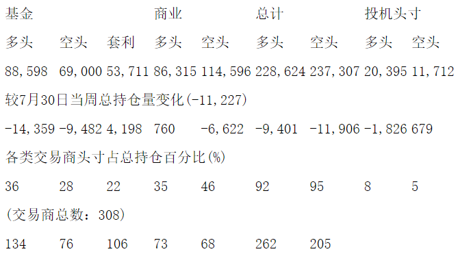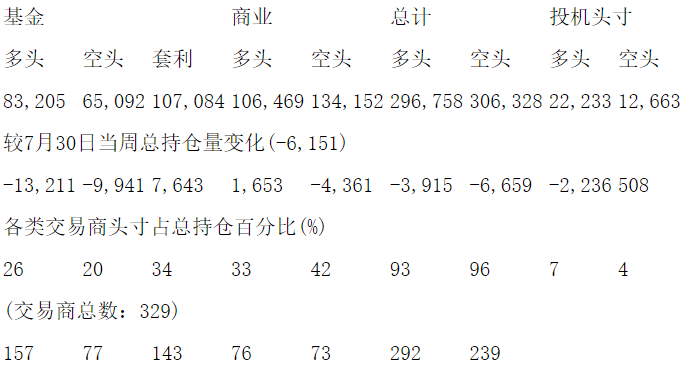 美国商品期货交易委员会(CFTC)最新公布截止8月6日当周COX铜期货和期权分类持仓报告: 合约单位:25000磅总持仓量:318990