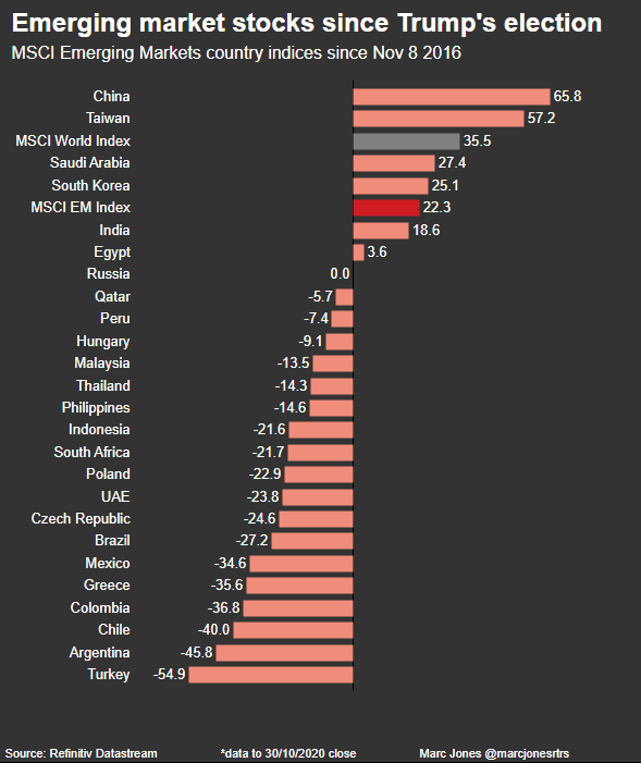 周一(11月2日),2016年,唐纳德·特朗普的竞选口号本可以是“建设华尔街”,但纵观全球市场,他建设的已经不只是华尔街,更是在特朗普一直关注的新兴经济体。
