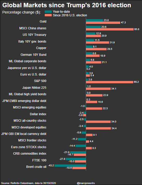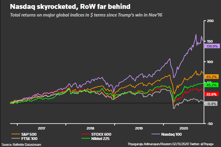 虽然今年的疫情危机可能夸大了这一数字,但大多数分析人士认为,特朗普的减税政策,加上低利率和网络繁荣,使华尔街成为过去四年的赢家。UniCredit的首席经济学家埃里克·尼尔森(Erik Nielsen)强调,在特朗普任期内,标普500指数实现了65%的总回报率,而欧洲斯托克600指数只有可怜的14%。