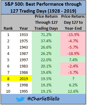 ①标普500指数今年迄今上涨了19.5%,这是自1997年以来最好的历史同期表现。