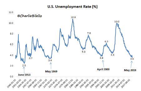 ②当前美国失业率已跌至3.6%,这是自1969年以来的最低水平。
