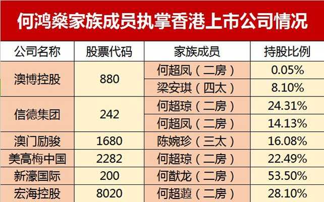 其中,二房的何超琼、何超凤分别持有信德集团24.31%和14.13%的股份。澳博控股方面,最大的股东是澳娱,而何超琼与霍启东家族结盟,持有53%的澳娱股份,也就是说何超琼间接控制着澳博控股,而且澳博的掌门人正是何超琼的妹妹何超凤。