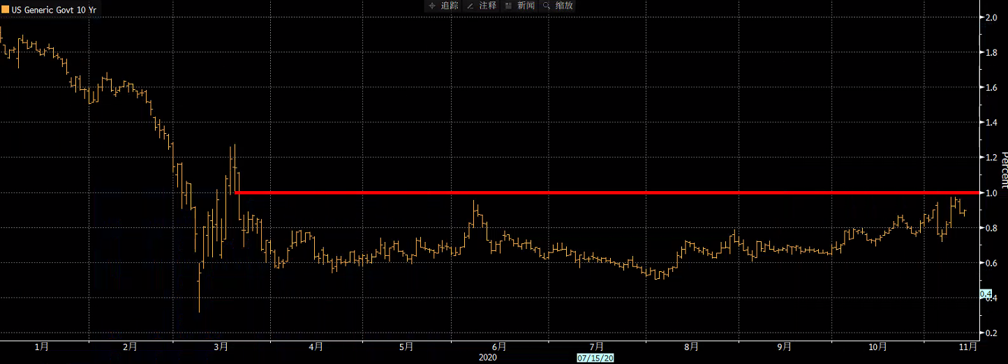 上周,所有人都在关注美国10年期国债收益率能否达到1%。大选后的抛售将其隐含收益率推至该水平附近,为3月份以来的首次。随后,新冠肺炎病例激增推动了市场的反弹,使该收益率在上周结束时达到0.9%,但仍未达到1%的水平。