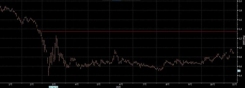 11月15日(上周日),市场分析师Vivien Lou Chen撰文称,随着疫情的不断加剧,美国10年期国债收益率被证明难以突破1%的水平。实际上,美国大选后的抛售也未能使10年期国债达到0.99&的隐含收益率水平。不过,多数机构预测美国10年国债收益率倾向上升。高盛预测,到2021年年底,10年期美国国债收益率应该会达到1.3%。美国银行表示2021年第三季度能升至1.35%,但未来几周几乎不可能实现。
