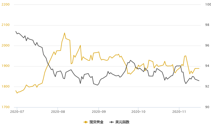 周一(11月16日)金银T+D双双触及四日高点!现货黄金价格周一日内随美元指数再度回落而一度走强,但在上触1900美元关键心理阻力位失败后回落,回吐了全部涨幅;虽然美欧疫情顾虑连同美国政局波动,仍对全球风险偏好情绪起到打压作用,但日内亚洲经济数据表现强劲的状况,却令黄金的避险价值仍些微失色,更多资金仍在流向亚系货币及相应资产。美元指数在周一开盘后继续承压走低,触及一周低位92.55,因美国大选计票悬疑剧继续上演,政治僵局之后年内达成新版财政援助协议的可能性已经基本为零,这令美联储入市“救火”在所难免。在辉瑞宣布疫苗有效性超90%、以及礼来新冠抗体药品获FDA紧急使用授权后,接下来的几周里,更多“疫苗和神药”数据还将发布。