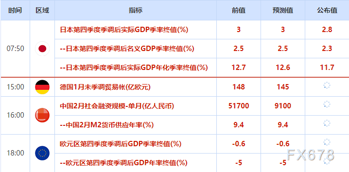 ④ 周二数据显示,日本经济在10-12月连续第二个季度取得增长,环比年率为增长11.7%,弱于初值12.7%,也逊于经济分析师预估中值的12.8%增幅。10-12月经济较前季扩张2.8%,初值为扩张3.0%。