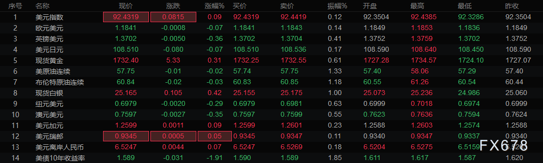 ① 避险货币美元周三逼近四个月高点,现报92.39,因对欧洲第三波新冠疫情、美国可能加税以及西方和中国之间紧张局势升级的担忧削弱了风险偏好。