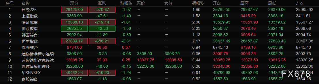 股市方面,日经指数一度跌超2%,恒指跌逾2%,其余指数普遍下跌,美股周二大跌打击了风险偏好。