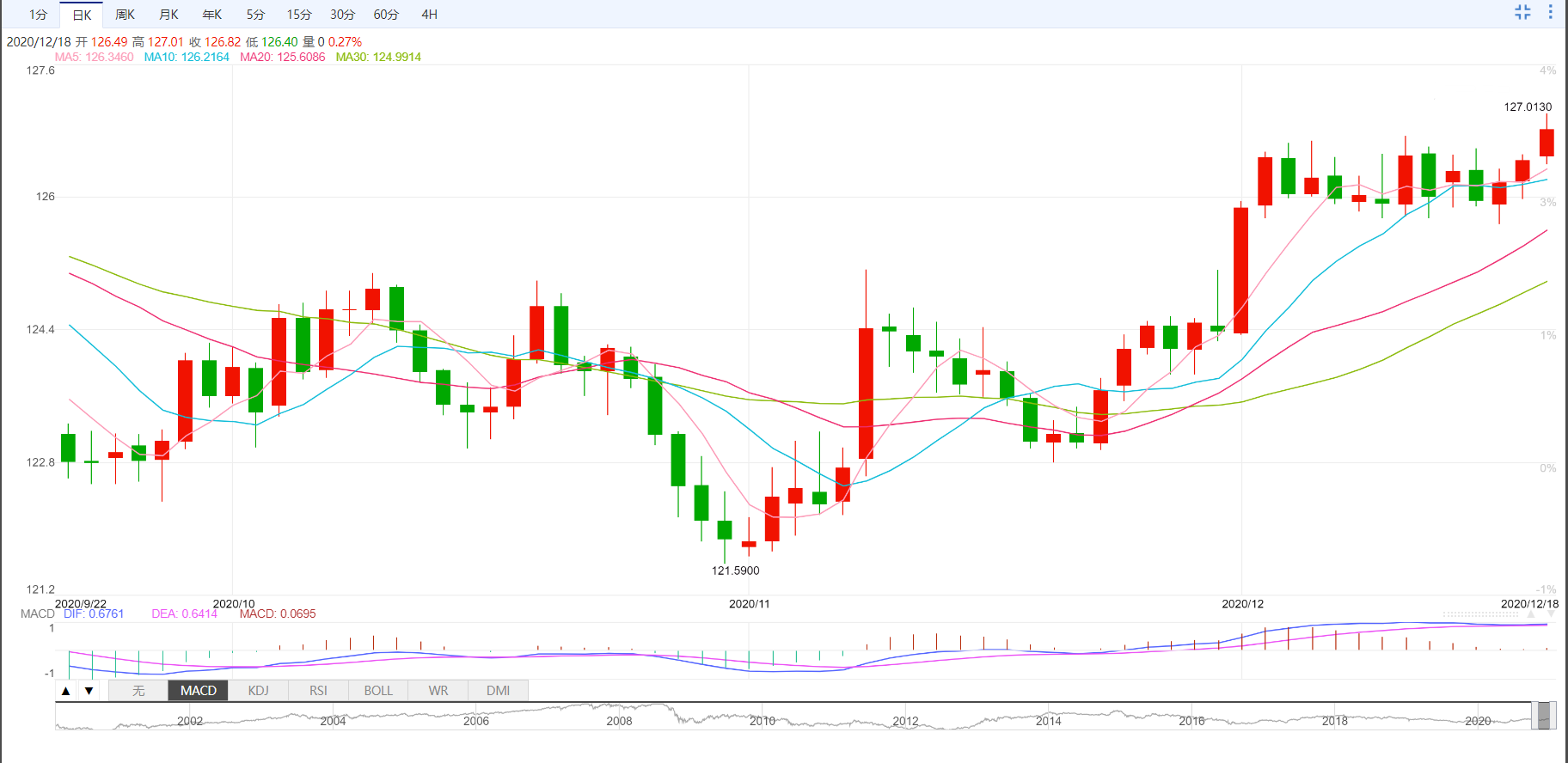 反之,若日线收盘在旗形阻力位126.74遇阻回落,则可能会重返50%斐波为125.52,若跌破21日均线(125.47)则可能会打开下行空间挑战10月高点125.08。