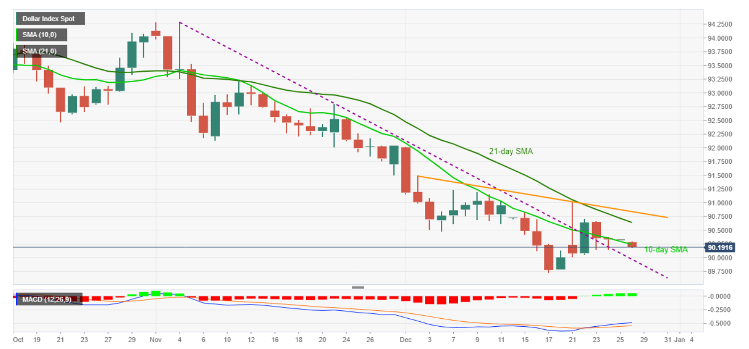 美国总统特朗普签署新冠疫情财政刺激救助计划后,美元下跌。截止发稿,继近期下跌后,美元重测10DMA下方,美元空头接近8周支撑,目前处在89.97附近。