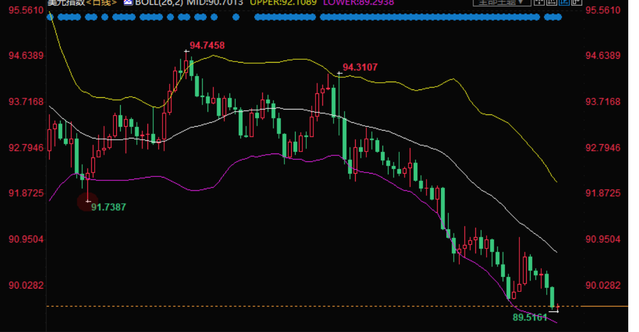 美元指数空头目标处在数日低位89.50附近。然而,空头最终目标或将重测2018年低点88.25附近。在此期间,2018年4月低点89.20附近构成支撑。