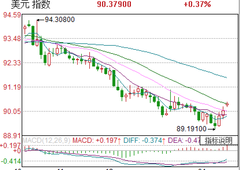 周一亚市早盘美元指数维持走强,涨至90.37,上涨0.37%。美元涨至维持上行趋势的通道内,刷新12月24日以来的高位。