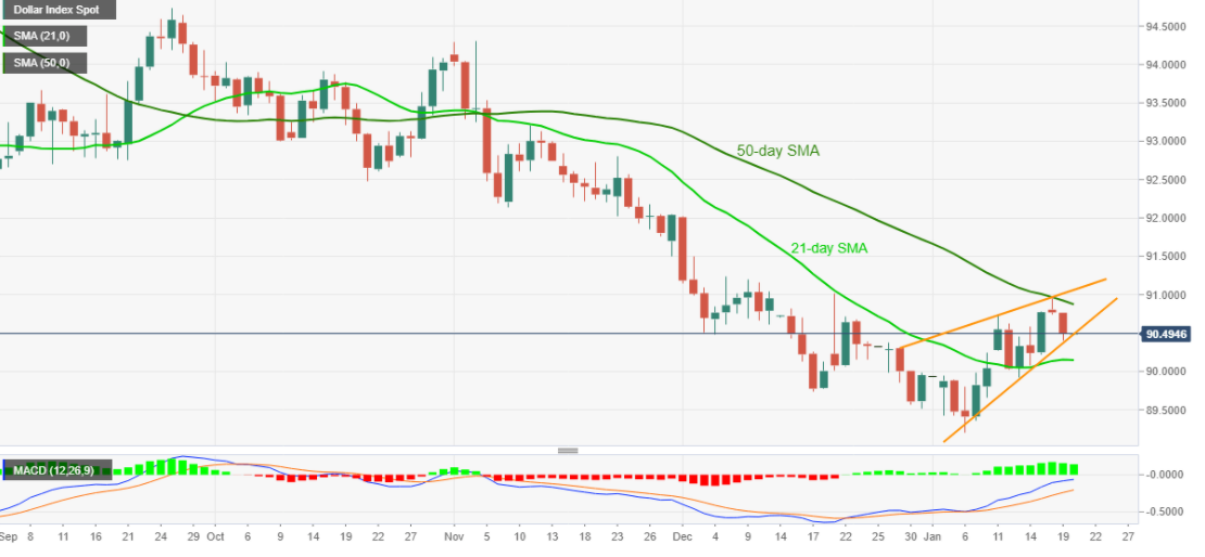 升破50日SMA均线90.87需要通过突破形态阻力线91.00才能否定看跌形态。美元指数多头将关注12月7日高点91.25和2020年9月低点91.75以及92整数关口。