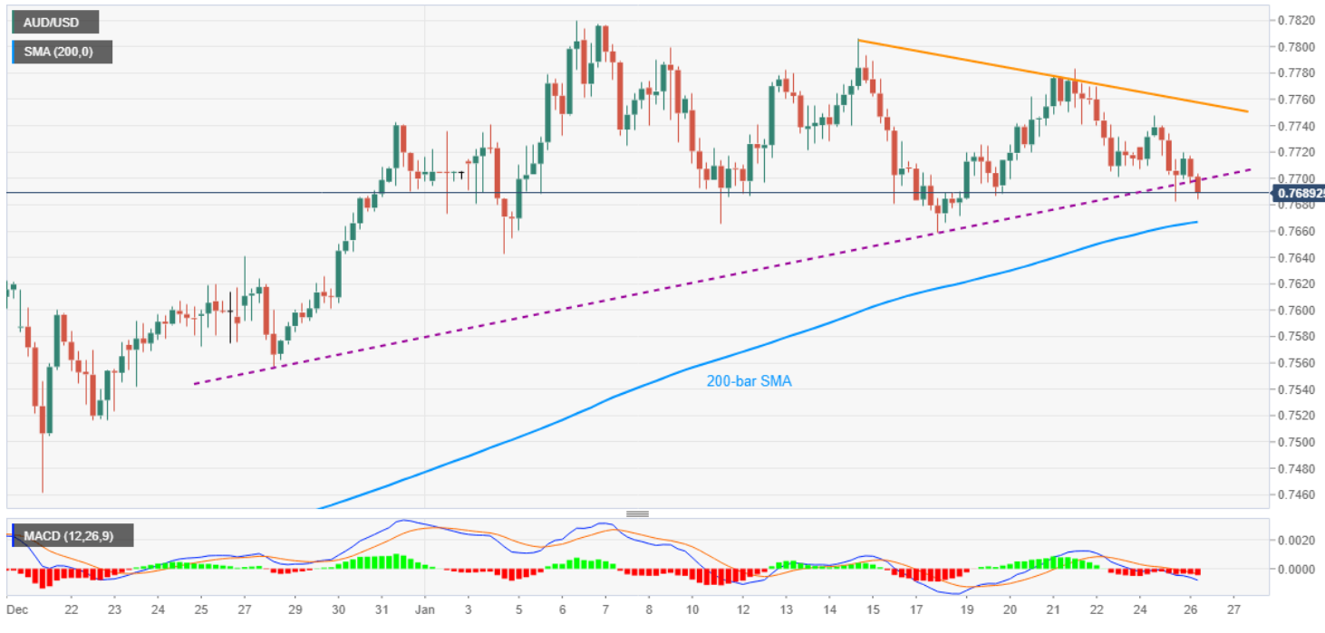若汇价跌破0.7640,汇价将测试12月28日低点0.7560,然后是上月底低位0.7460附近。若汇价突破前期支撑构成的阻力即0.7700关口附近,将上测短期下降趋势阻力0.7760附近。