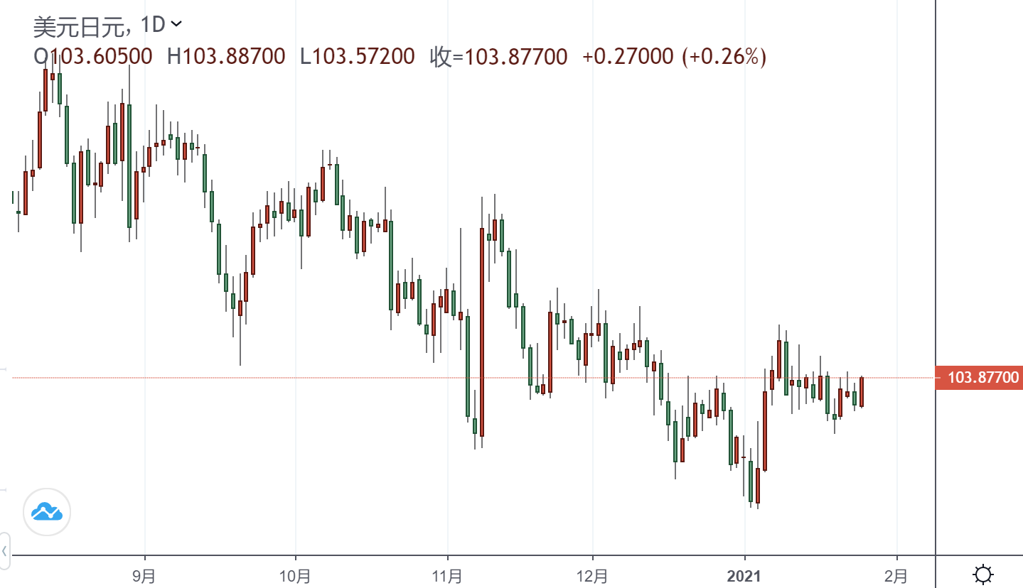 美元兑日元在欧洲市场早盘维持温和涨势,尽管缺乏强劲的后续买盘。美元兑日元仍在前一天的交易区间内,最后交投于103.65-70区域。截止发稿,汇价上涨0.26%至103.87。