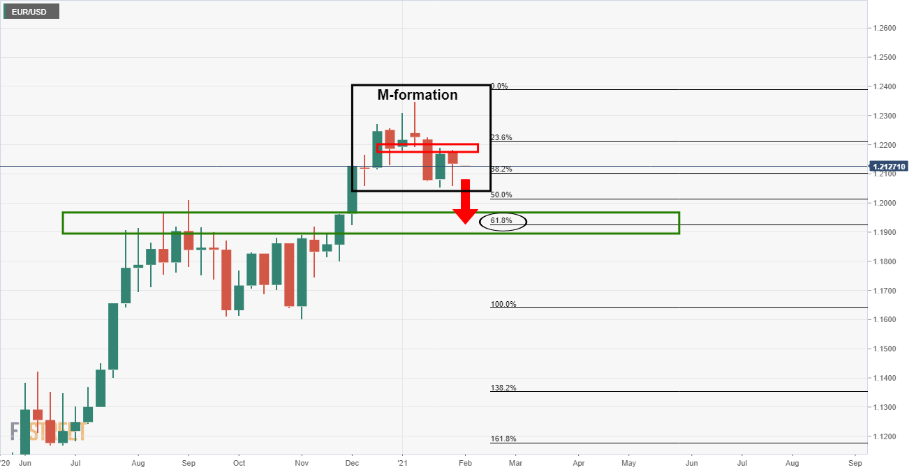 月度图表显示,欧元汇率现在在供应区域的空头手中,预计将回到月度看涨冲动的61.8%斐波那契回调线。
