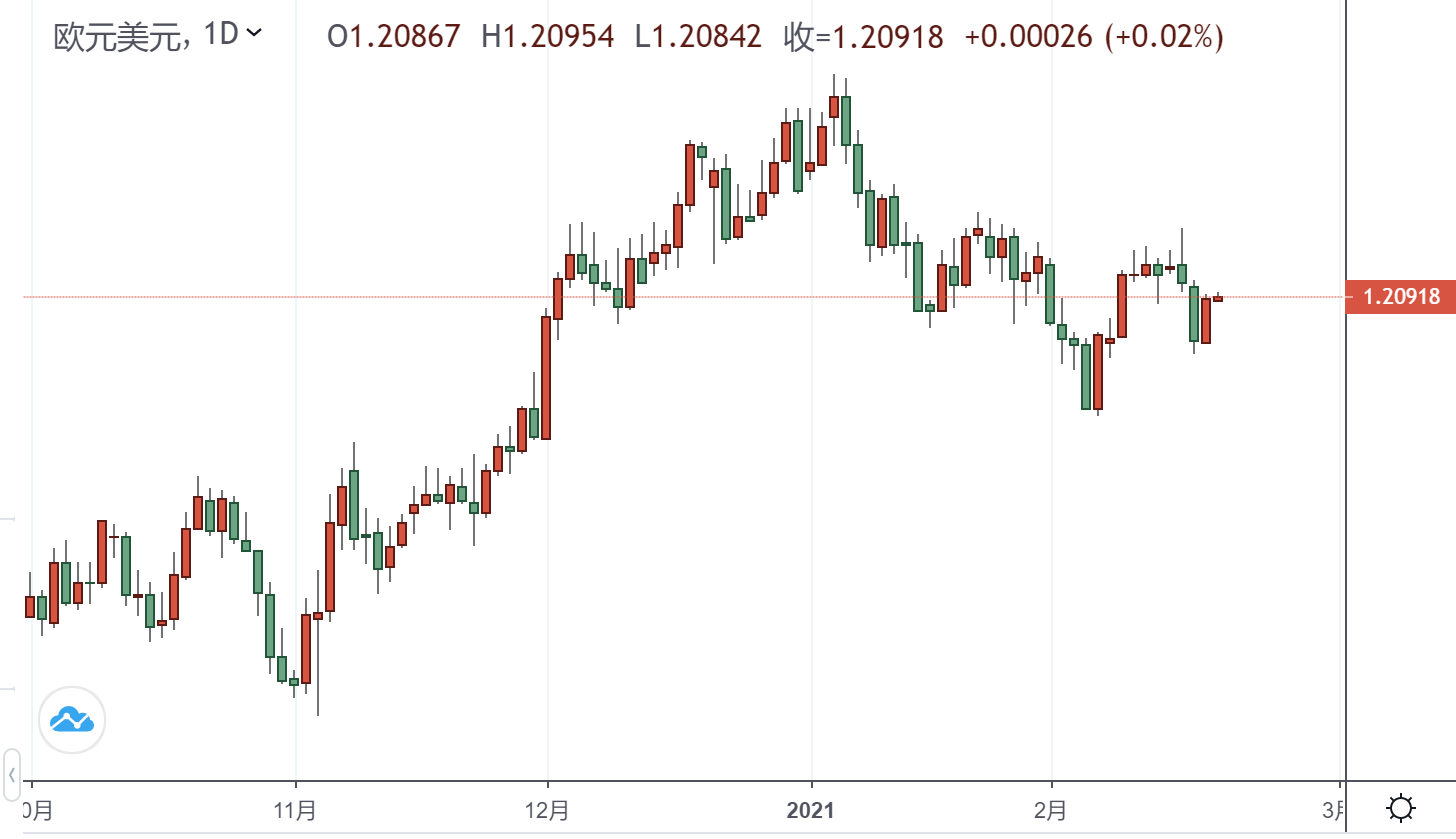 周五(2月19日)欧市盘前,欧元兑美元刚刚触及1.2100关口,最新报1.2100,日图涨0.07%。