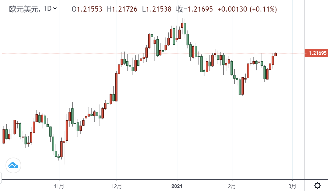 周二亚盘,因美元走低,欧元/美元上涨0.10%至1.2168。日内关注美联储主席鲍威尔在参议院就半年度货币报告作证词。