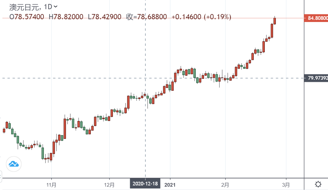 澳元/美元:在全球通货再膨胀的主题下,澳元投资者将有望看到澳元出现广泛的强势。澳元/美元在本周早期突破站上0.7900一线,目前正在看向0.80一线。1月至2月涨势的161.8%斐波延展水平将有望为澳元/美元提供短线阻力,随后有望测试心理关口0.8000一线。然而,短线回调可能即将出现。相对强弱指标开始转跌,进入超卖区域。