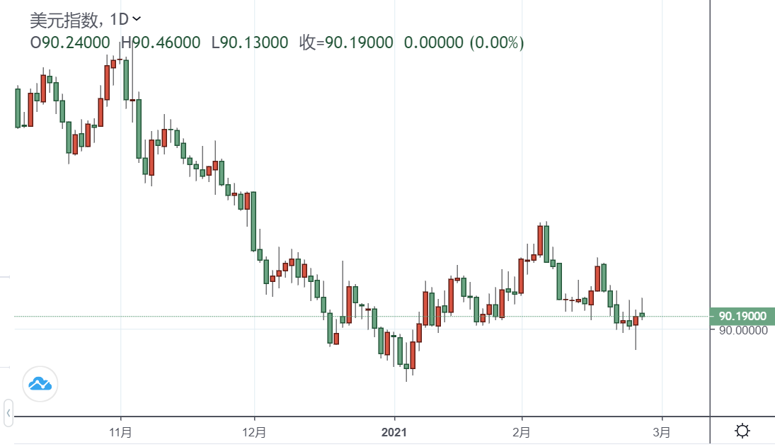 周五(2月26日)亚盘,美元指数下跌0.06%,位于90.19附近。日内市场聚集美国PCE数据及美国新版纾困法案。