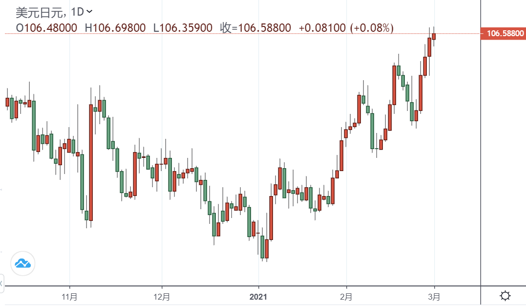 周一(3月1日)亚盘,美元/日元在连续四日反弹后高位盘整,目前交投在106.60附近。