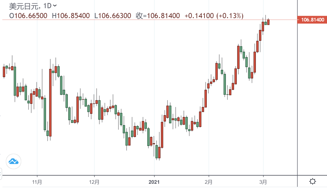 周三(3月3日)亚盘,美元兑日元小幅上涨,现报106.86,涨幅0.16%。因美元指数日内继续表现坚挺,而在澳洲GDP数据率先表现强劲后,市场对世界经济前景也仍持看好态度,令避险日元继续遭受抛压。