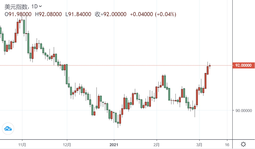 美债收益率不断上升,警告多头重新考虑近期因美国非农强劲和参议院通过新冠疫情财政刺激法案带来的乐观情绪。同时打压投资者的是近期中国和日本贸易数据以及中国提出反对美国干涉台湾事务。