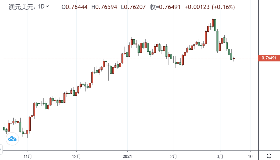 周二(3月9日)亚盘,澳元兑美元挑战0.7670区域附近的高位,此前其从多日低点0.7621水平强势反弹。由于美国国债收益率回落,标准普尔500指数期货上涨,澳元兑美元反弹。与此同时,乐观的澳大利亚国民银行调查,疫苗进展和中美新闻推动澳元。
