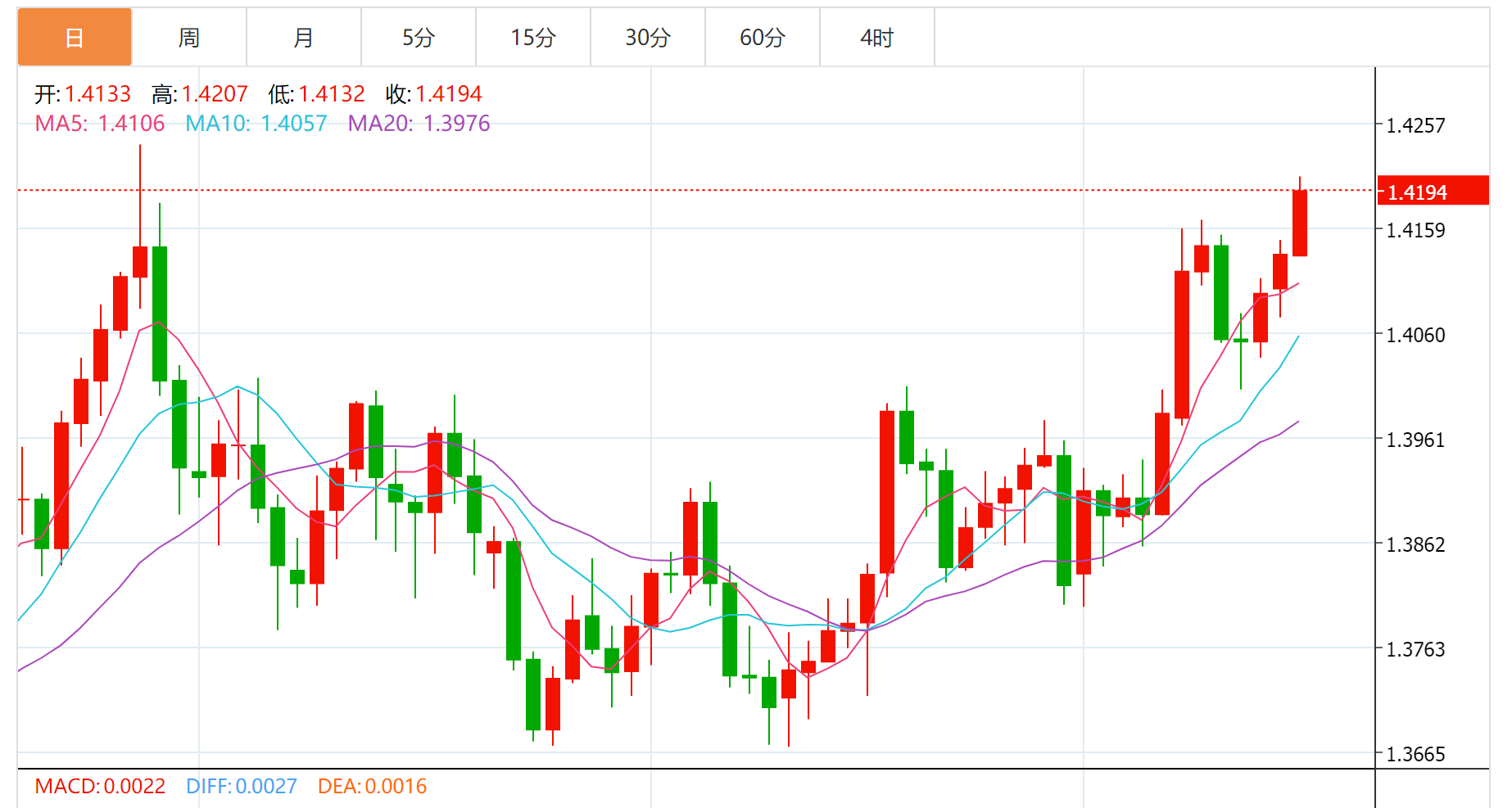 周二欧盘,英镑/美元在连续两日反弹的基础上进一步走高,一度触及1.4196,距离1.42大关不远。截止发稿,位于1.4198附近。