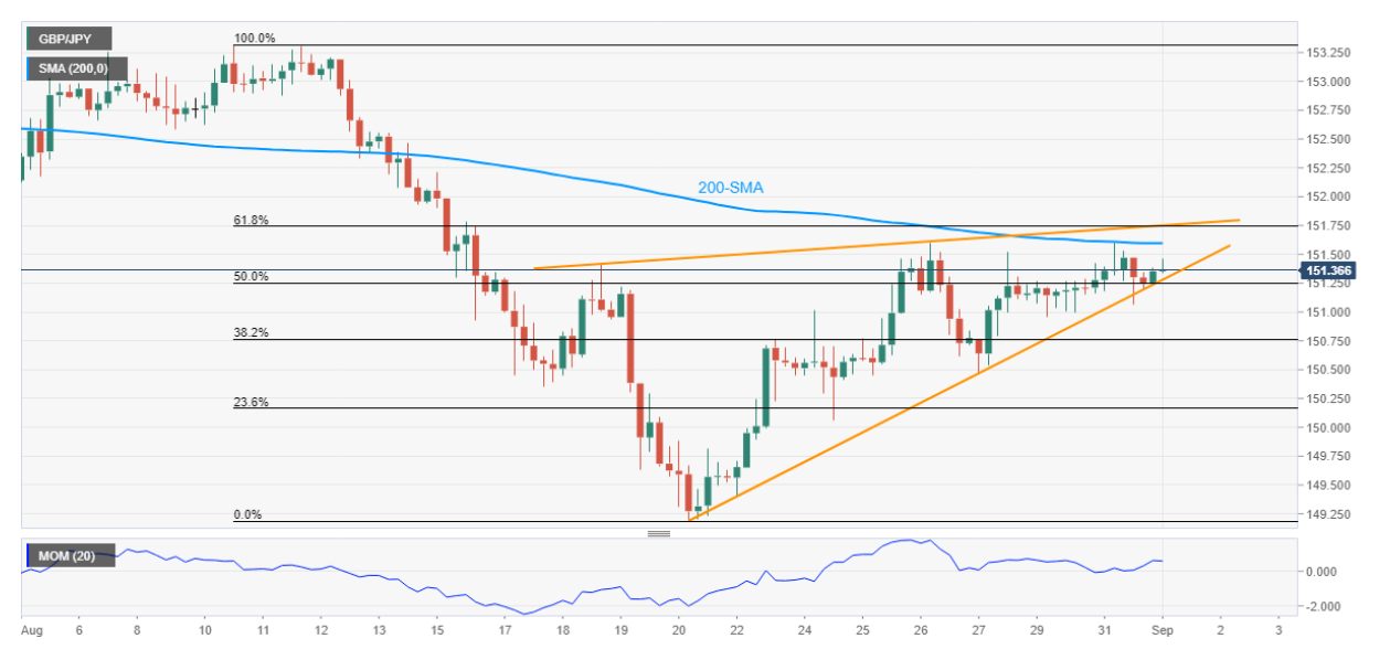 下行当中,150.00 关口成为空头目标,3 月下旬和7 月低点 148.50-45 附近,成为英镑/日元下行目标。或者,200-SM??A 水平151.60 成为英镑/日元上行阻力,然后是151.75 汇合水平,该水平汇合8 月10-20 日跌势的61.8% 斐波位和上述阻力。
