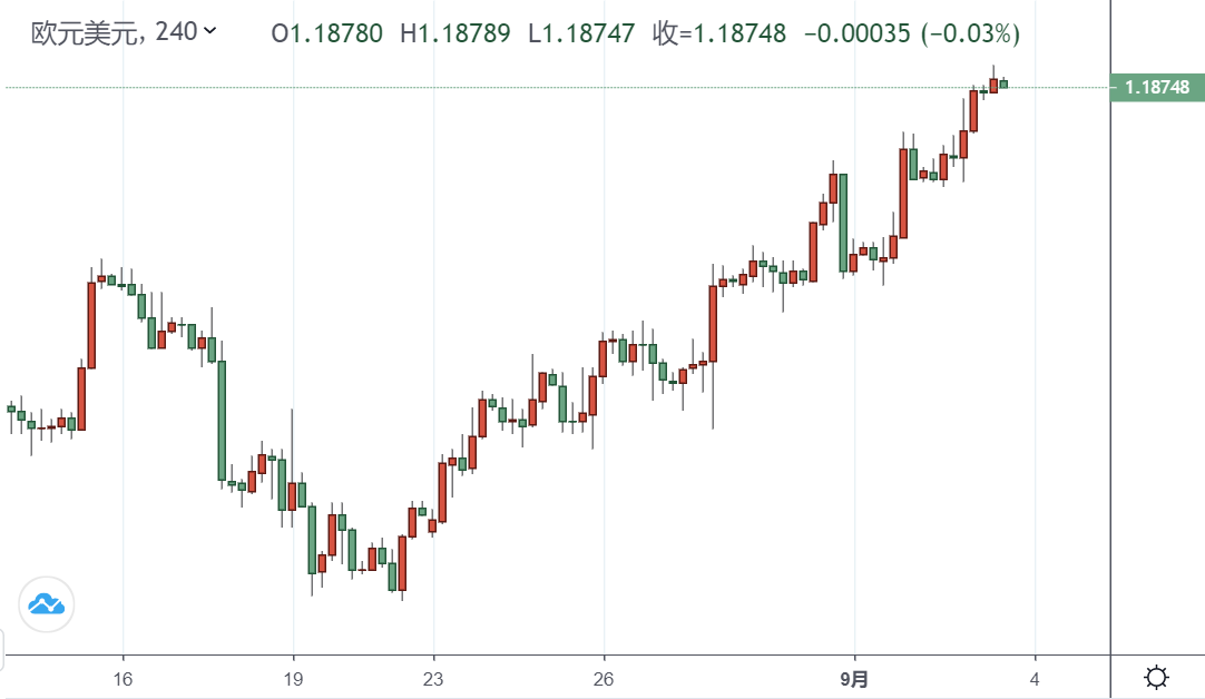 日图上行动能猛烈,上方逼近8月初高点1.1900附近,关注该档表现。4小时图再创新高,近期上行势头维持完好。小时图震荡上行,多头仍占主导。