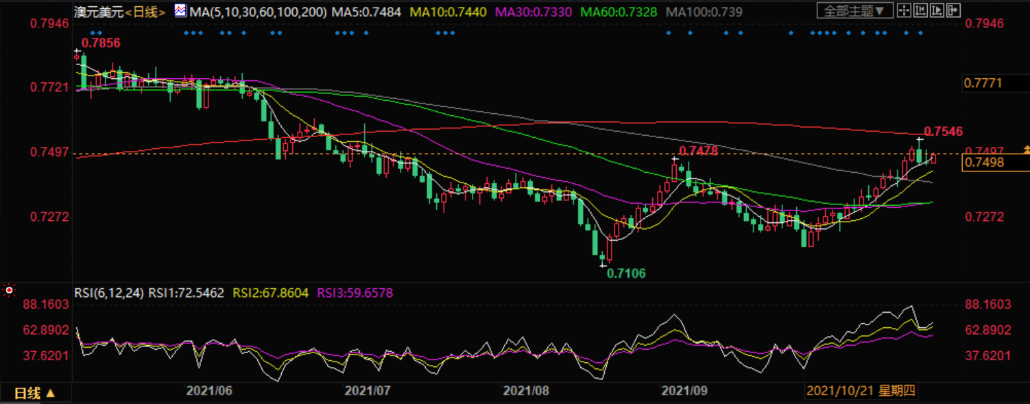 澳元兑美元在过去一小时设法从日低反弹超过40个i,并攀升至新的日顶,在0.7520-25区域附近。 该货币对周四吸引了一些低位买盘,扭转盘中跌至0.7480-75附近的三日低点,因押注澳洲央行(RBA)升息的押注升温。澳洲央行周三公布的第三季度平均通胀数据显示,消费者成本压力正变得根深蒂固。 这与疲软的美元价格走势一起,