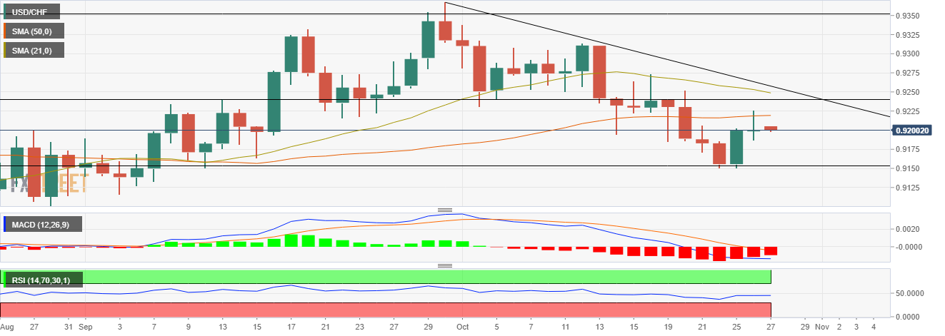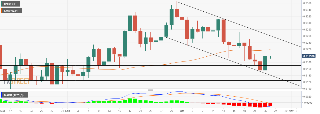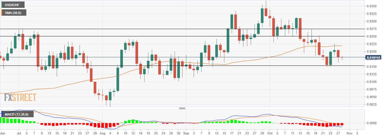 美元兑瑞郎在周二亚洲交易时间盘整了涨幅。该货币对在美国市场强劲上涨逾40点后,仍停留在一个相对狭窄的交易区间。截止目前,美元兑瑞郎的交易价为0.9199,日内上涨0.01%。 美元/瑞郎日线图 在日线图上,在9月30日测试了5个月高点0.9368之后,该货币对一直处于下行压力之下。较低的高点和较低的趋势可以在向下趋势