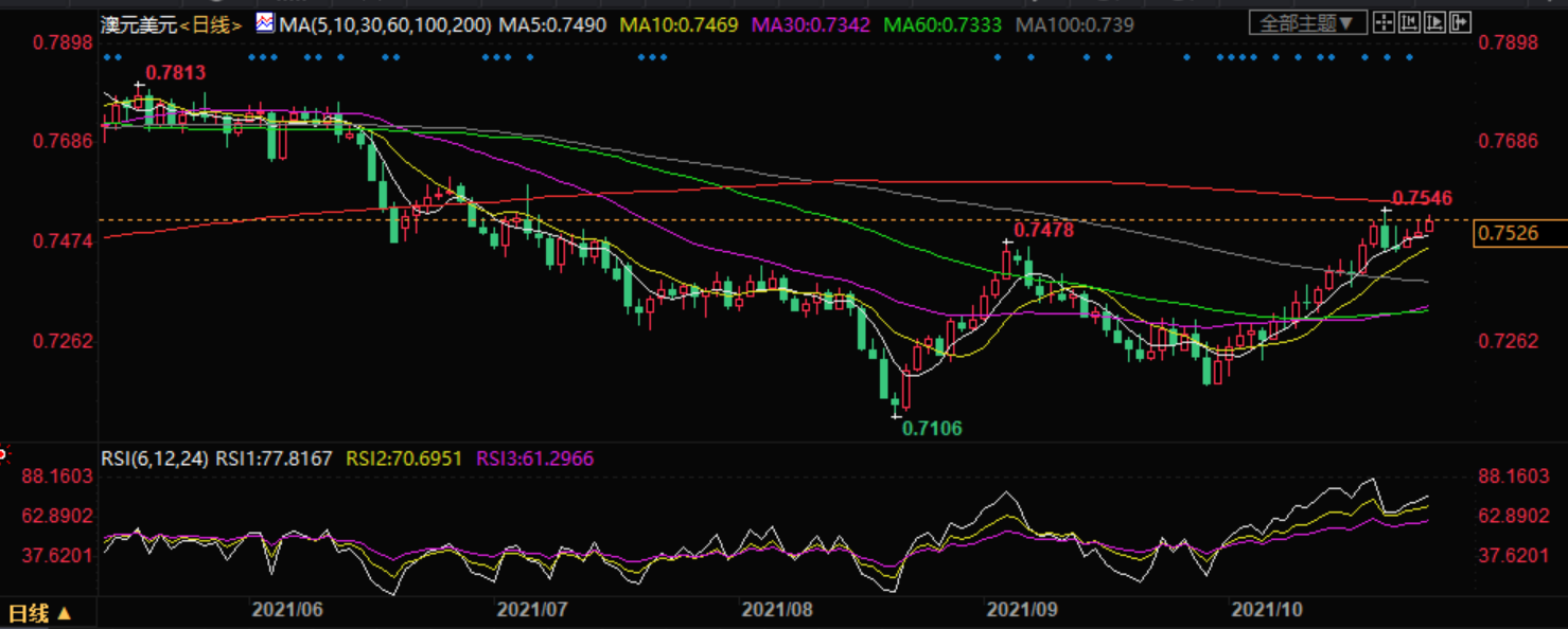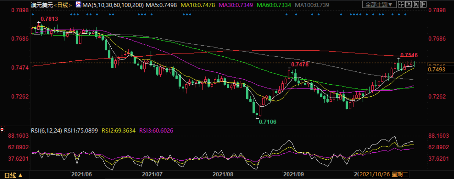 周三欧洲盘早期,澳元兑美元维持了盘中涨幅,最近一次徘徊在日顶附近,在0.7530区域附近,日内上涨0.40%。 该货币对连续第三天上涨,并在周三澳大利亚消费者通胀数据发布后创下本周新高。正如预期的那样,第三季度整体CI上涨了0.8%,同比涨幅从此前的3.8%降至3.0%。然而,澳大利亚储备银行(RrvBankofAutralia)倾向于削