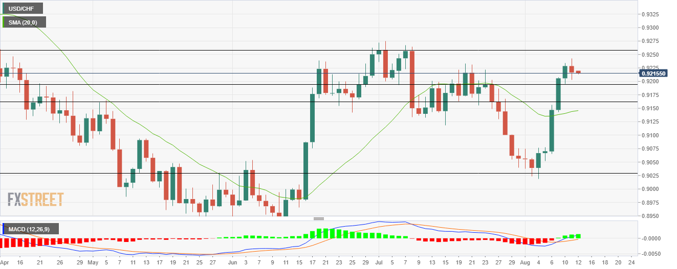 美元兑瑞郎在0.9230附近小幅走高,因亚洲交易员准备在周三转向西方市场。 即便如此,瑞郎兑瑞郎维持了前一天从4月初开始的下行阻力线的上行突破,相对强弱指数(RI)更坚挺,而不是超卖,这反过来又使报价保持进一步上行的态势。 值得注意的是,美元/瑞郎多头在面对4-6月下行和7月顶部的61.8%的斐波那契回调之前,有必要