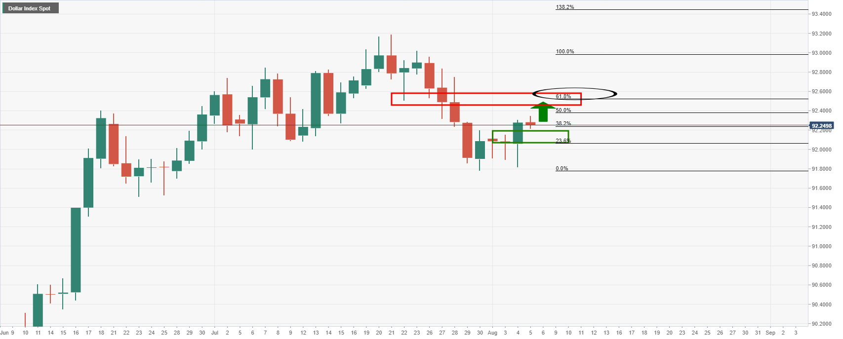 周五欧市盘初,欧元/美元下跌0.05%至1.1826附近。 基本面分析 美国政策制定者将刺激方案投票推迟到周末,新冠疫情数据连续多天处于高位,以及美联储的鹰派言论,推升了美国10年期国债收益率和美元指数(DXY)。在此背景下,标准普尔500指数期货在纪录高位附近挣扎,盘中下跌0.07%。 展望未来,美国7月份就业报告可能