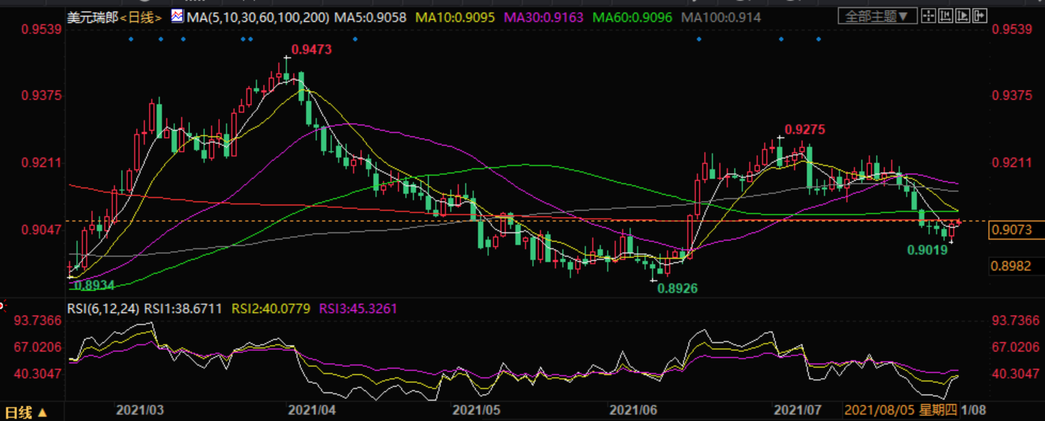周四,在隔夜触及0.9076的高位后,美元兑瑞郎在周四的亚洲交易时段徘徊不前。该货币对徘徊在窄幅交易区间,没有明显的牵引力。 截止目前,美元兑瑞郎的交易价为0.9065,当日下跌0.01%。 美元升值推动了美元/瑞郎的升值。美元指数反弹至92.20以上,上涨0.20%。 美国I非制造业采购经理人指数(I)7月升至64.1,远高于市场